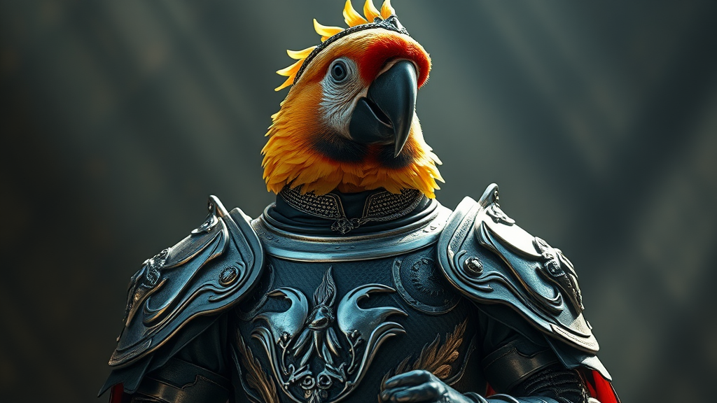 A regal parrot knight, adorned in intricately designed armor, the finely detailed silver plates glistening under cinematic lighting, with accents of luxurious silk woven into the ensemble. The backdrop features dramatic shadows and highlights, capturing the noble essence of the avian warrior in stunning 4k detail.