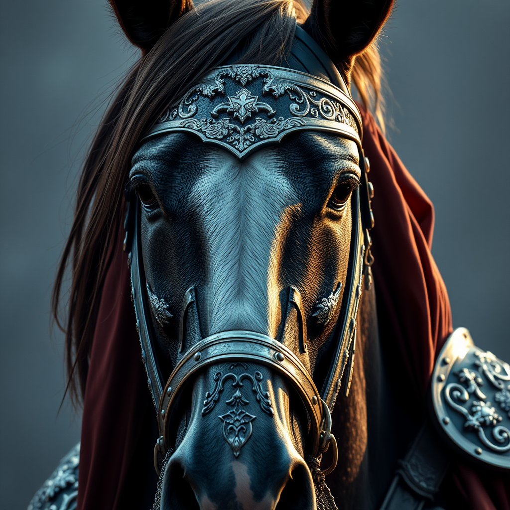 A regal portrait of a horse knight adorned in finely detailed armor with intricate silver designs, the combination of metal and silk gleaming under cinematic and dramatic lighting, capturing every nuance and texture in stunning 4k resolution, creating a majestic and awe-inspiring vision.
