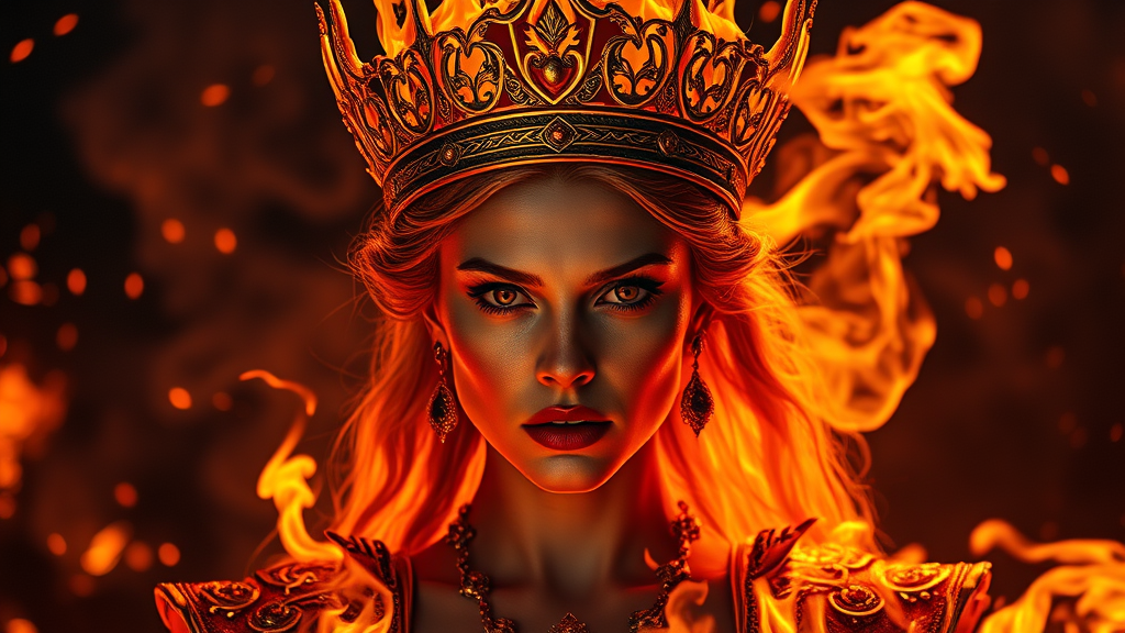 A regal queen adorned with a crown of flickering flames, her fierce gaze commanding respect and awe, set against a backdrop of swirling embers and ash, dramatic lighting casting her in both shadow and brilliance, intricate details of her fiery attire glowing with intensity, embodying the essence of flame and power in a photorealistic and epic portrayal.