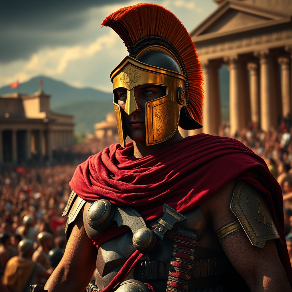 A regal spartan warrior adorned in dark crimson and gold stands boldly against a backdrop of ancient grandeur, captured in the timeless style of academic classicism and rendered in exquisite 32k UHD. Amidst the playfulness of bronze hues, the scene is alive with the detailed energy of vibrant crowd scenes, reminiscent of an associated press photo. Beneath the warrior's steadfast gaze, the epic landscape unfolds, merging historical majesty with artistic brilliance, encapsulating the essence of heroic legends in breathtaking visual splendor.