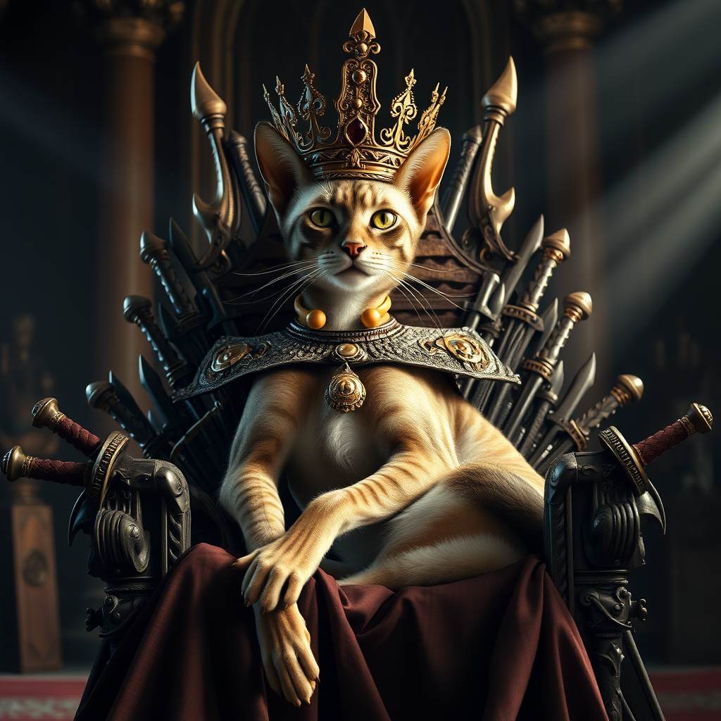 A regal sphinx cat embodying Queen Cersei, adorned with an intricate crown, reclines majestically on a throne crafted from intertwined swords; the scene is set in a grand hall with intense, cinematic lighting casting dramatic shadows, capturing the essence of photorealism, vertical composition.
