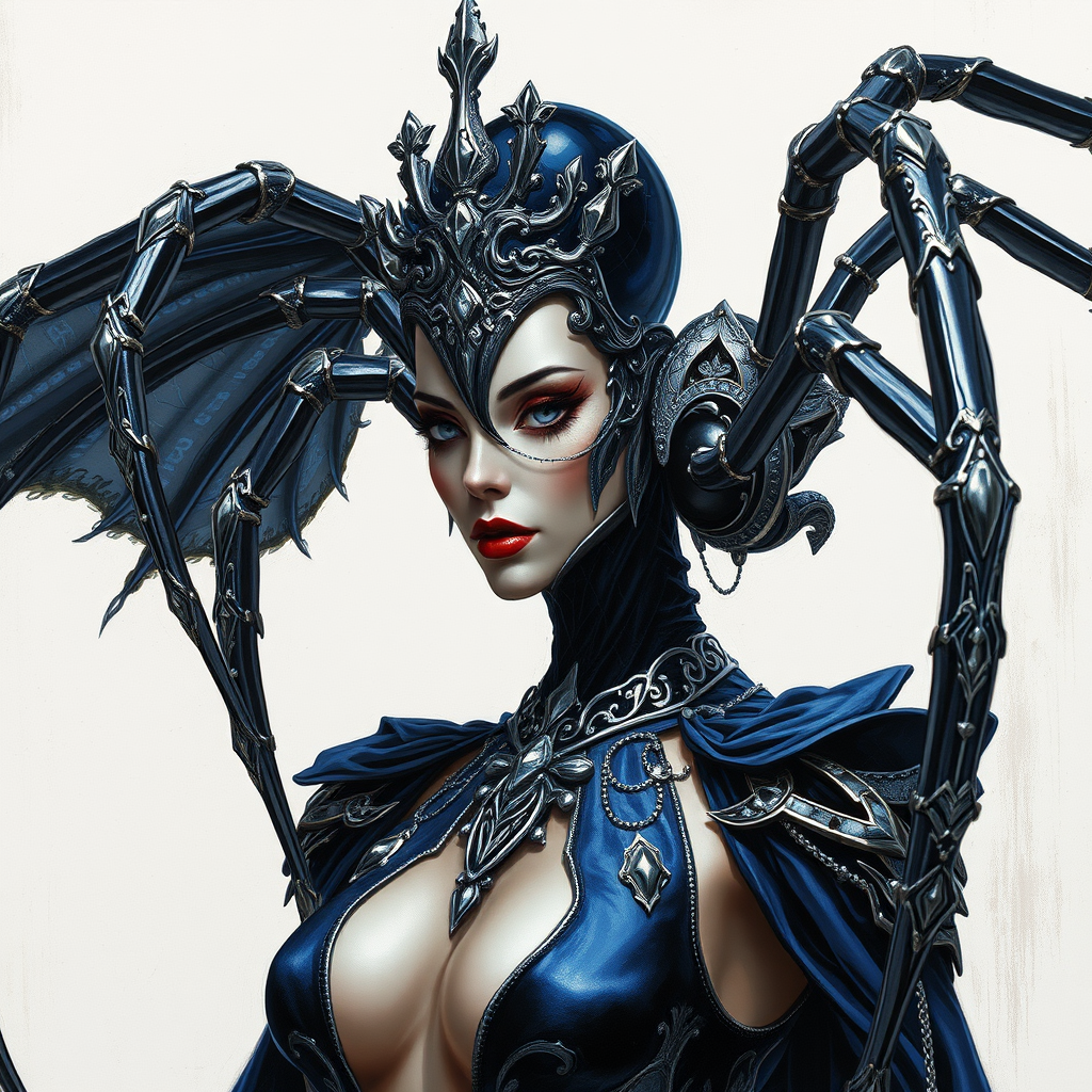 A regal woman embodying the essence of a spider queen, drawing on the mystical allure of Eledrae by Taijen 3, styled with the opulence of Boris Vallejo. Her presence is a tapestry of dark sapphire and gleaming silver, capturing the elegance of polished metamorphosis. Marvel at the trompe-l'œil illusionistic detail that blurs reality, presenting a contemporary spider-woman. Envisioned with large-scale brushstrokes, there is a seductive harmony between complexity and stripcore aesthetics, resulting in a captivating and majestic figure.