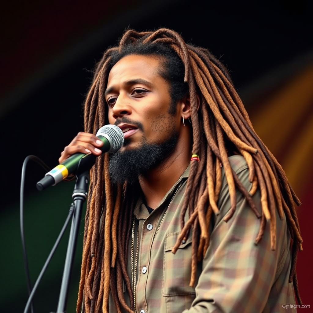 A reggae musician known for his soulful voice and message of unity and peace, with dreadlocks flowing like waves of rhythm, whose songs inspire freedom and upliftment, blending roots with a timeless call for harmony and social change.