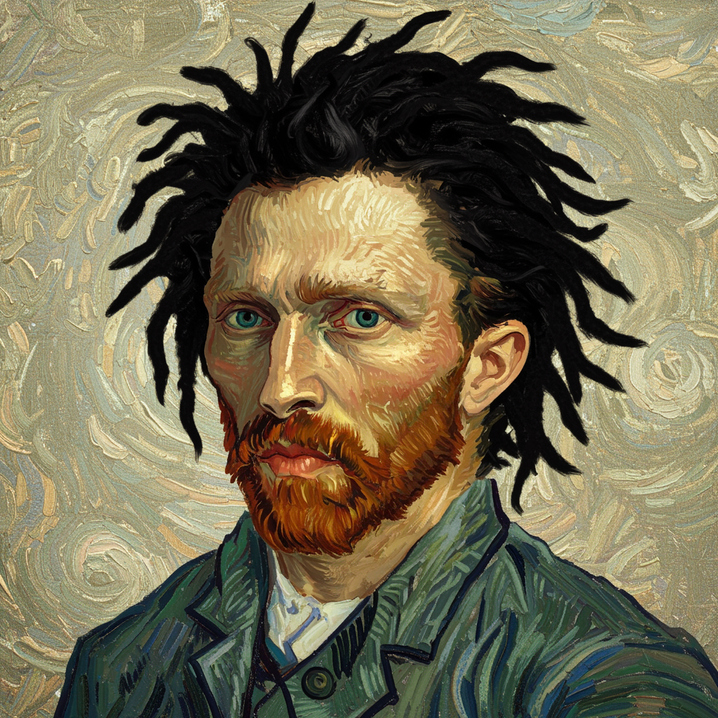 A reimagined portrait of Vincent van Gogh with vibrant black dreadlocks cascading around his face, his piercing eyes and intense expression capturing the essence of his creative spirit, set against a swirling, textured backdrop reminiscent of his iconic brushstrokes.