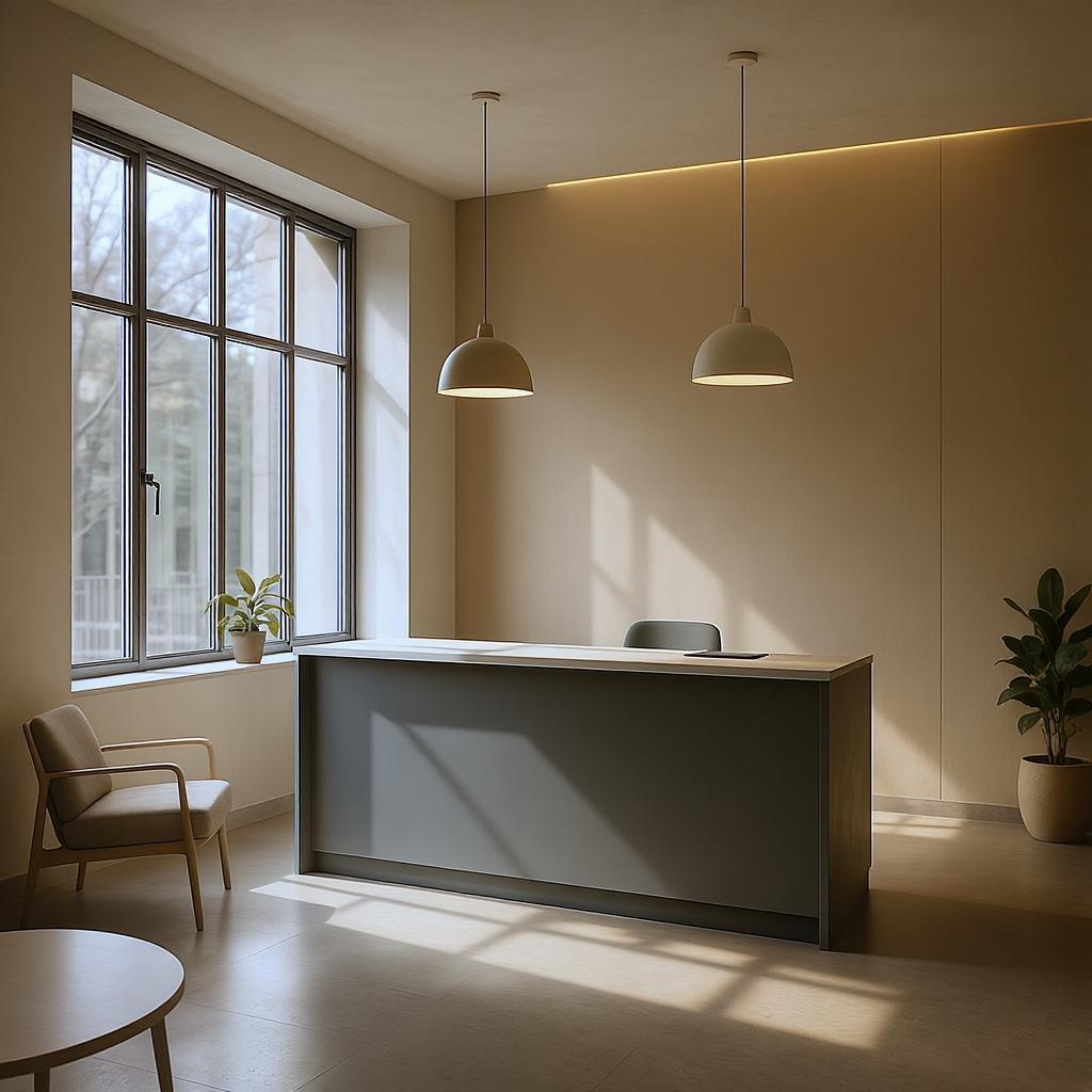 A relaxed office reception area with a minimalist design features a sleek desk subtly illuminated by the morning sun streaming through large windows, accompanied by the gentle glow of modern pendant lights and soft, indirect lighting that adds a warm ambiance, all captured with the precision of a Leica SL2 camera.