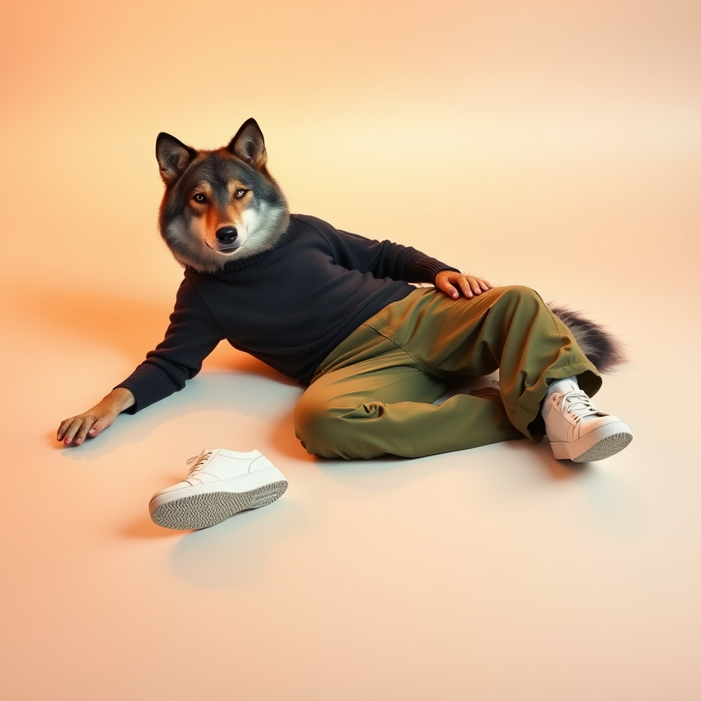 A relaxed wolf lounges on a sleek, minimalist white floor, adorned in a chic, realistic charcoal turtleneck. This nonchalant pose accentuates its loose-fitting olive-green trousers and crisp white trainers. The backdrop radiates a soft amber glow, providing a striking contrast that amplifies the surreal ambiance. This fusion of contemporary style and untamed essence emphasizes the wolf's expressive demeanor and sets the mood.