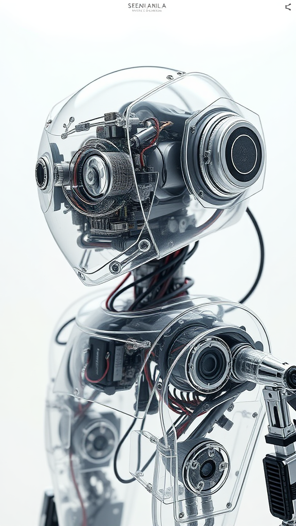 A remarkable and award-winning fully transparent robot featuring a captivating concept design. Its polycarbonate body showcases a complex network of PCBs, wires, and electronics, presenting a visually stunning technological display. Set against a white background with screen space and glass reflections, the color palette is thoughtfully curated to highlight the robot’s detailed and innovative design. This cutting-edge mechanical concept art features unique elements such as deformed iris and pupils. The overall look is semi-realistic, maintaining a high level of detail, and is captured in monochrome to emphasize the intricate craftsmanship. The visual presentation avoids any low-quality attributes and maintains clarity without any text, signatures, or watermarks. The final result is a sleek and muscular form, presented in a stylish and sophisticated manner.