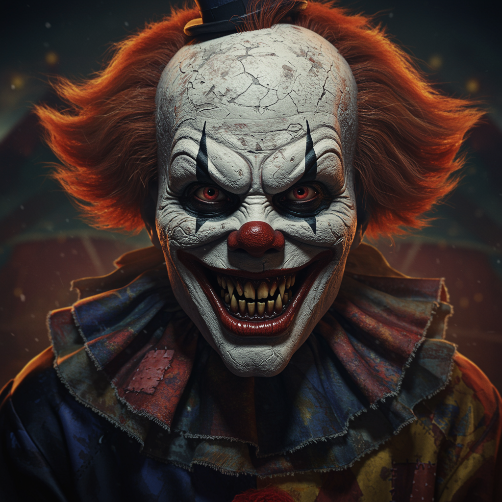A remarkably detailed photograph captures a sinister clown with an unnerving aura, its twisted grin revealing jagged teeth beneath a cracked, heavily painted face. Dark, hollow eyes radiate a malevolent glint, contrasting sharply with the chaotic swirls of vivid colors adorning its hair. Ragged, mismatched patches on the clown's tattered costume suggest years of malevolence as an air of foreboding hangs thick around it, casting unsettling shadows in the dimly lit carnival setting. The scene, with its cruel laughter echoing in the background, conveys the haunting essence of an evil soul lurking beneath the garish facade.