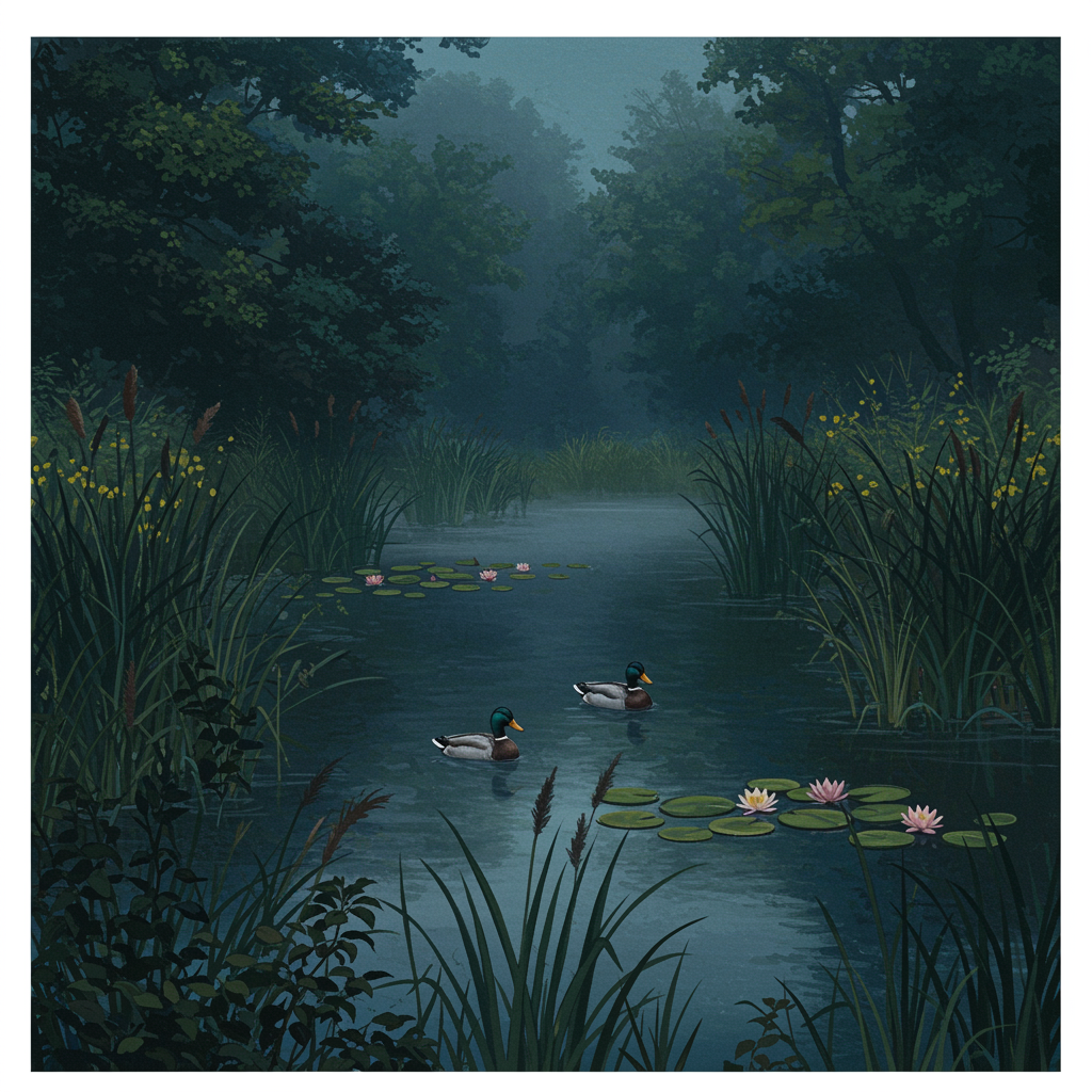 A Renaissance-inspired painting captures an isolated pond adorned with lily pads and graceful ducks, framed by wisps of tall grasses and an array of wild plants. The backdrop reveals an enigmatic forest, dense and shadowy, adding to the mystique. The color palette weaves together deep blues, rich greens, muted grays, soft lavenders, and dappled yellows, creating an atmosphere that exudes both gloom and intrigue. Subtle mist hovers above the water's surface, enhancing the mysterious allure of this secluded oasis.