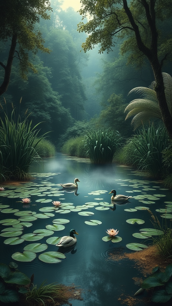 A Renaissance-inspired painting depicting a secluded pond adorned with lily pads and graceful ducks, encircled by lush, towering grasses and vibrant flora. The backdrop unfolds into an enigmatic forest shrouded in dense foliage. The color palette features deep sapphire blues, verdant greens, muted grays, soft violets, and hints of golden yellow, evoking an atmosphere of somber mystery. Silvery mist lingers over the water, adding an ethereal layer to the haunting scene.
