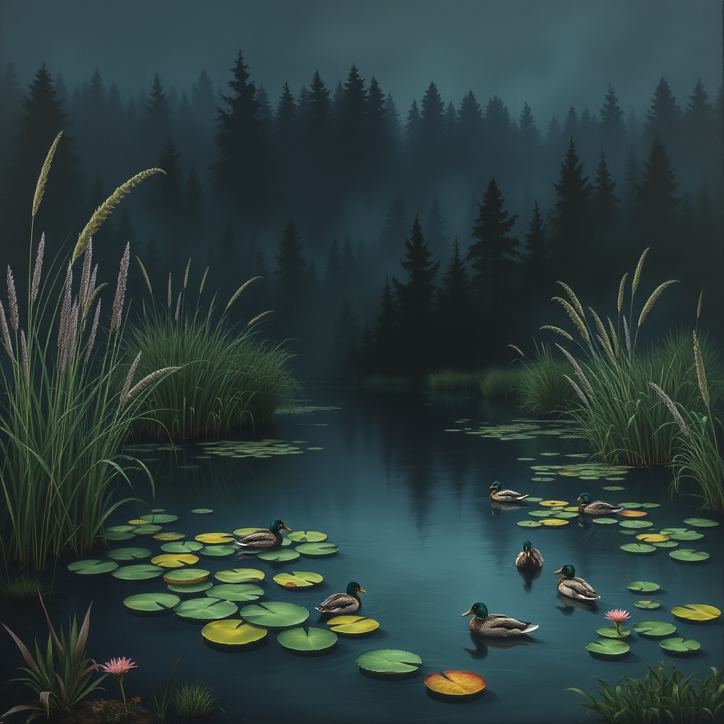 A Renaissance-inspired painting depicting a secluded pond dotted with lily pads and gliding ducks, encircled by towering grasses and lush plants. In the background, a dense, shadowy forest looms mysteriously. The color palette features deep indigo, emerald green, slate gray, soft lavender, and muted yellow, casting a moody and atmospheric ambiance.