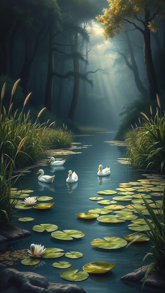 A Renaissance-inspired painting depicts a secluded pond adorned with lily pads and graceful ducks gliding across the calm water. The pond is encircled by towering grasses and lush plants, while a dense, shadowy forest looms mysteriously in the background. The color palette blends deep blues, rich greens, muted grays, soft lavender, and hints of golden yellow, creating an eerie yet captivating atmosphere. Delicate rays of sunlight pierce through the forest canopy, casting a dappled glow on the scene and adding a touch of intrigue to the tranquil landscape.