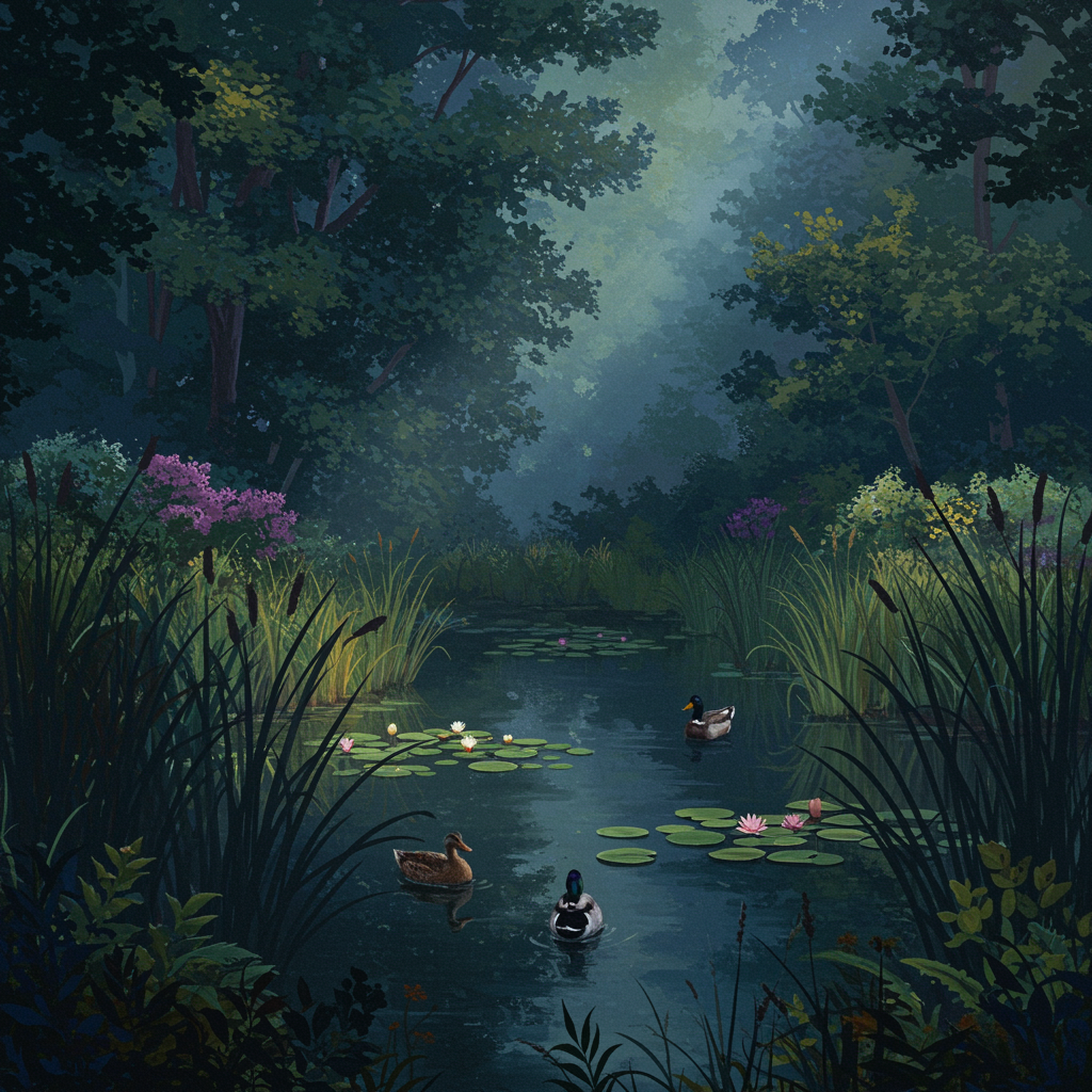 A Renaissance-inspired painting depicts a secluded pond with lily pads and graceful ducks, encircled by tall, whispering grasses and lush flora. In the background, a dense forest looms, shrouded in mystery. The color palette features deep blues, rich greens, muted grays, soft purples, and subtle yellows, casting a moody and atmospheric ambiance. Gentle beams of light pierce through the canopy, highlighting the delicate interplay of shadow and color, evoking a sense of serene solitude.
