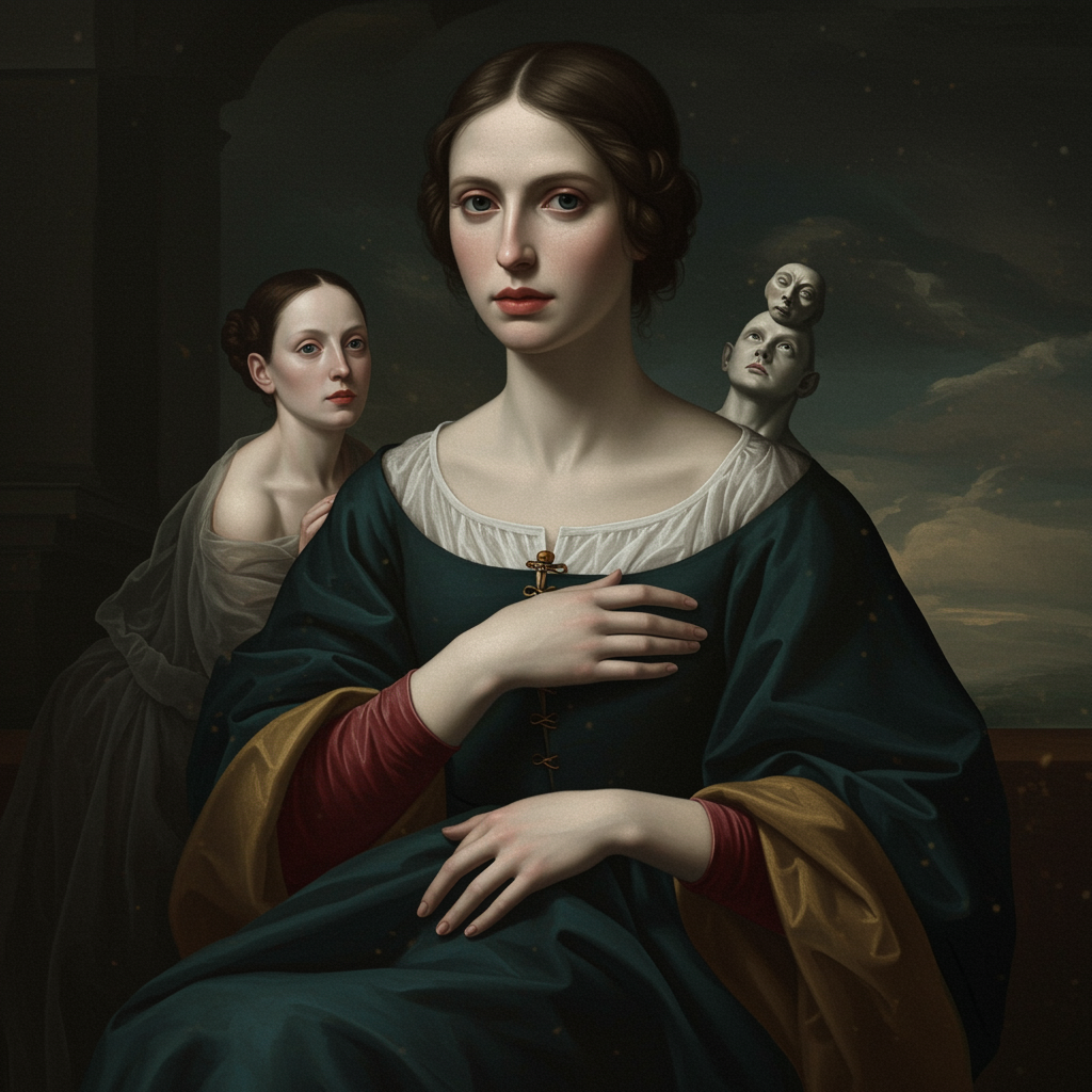 A Renaissance-inspired painting influenced by Caravaggio and Banksy with subtle hints of Lucian Freud. The composition presents a mysterious background in ultra-clear resolution, achieving a striking balance. The artwork exudes a surreal, ethereal atmosphere with intense expressive power, designed in a compelling composition that subtly reflects on society. Illuminated with low-key cinematic lighting, the scene blends traditional and surreal elements in a visually captivating manner.