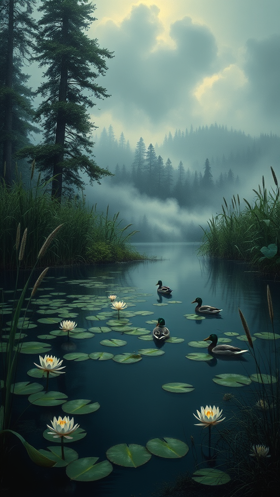 A Renaissance-inspired painting of a secluded pond adorned with lily pads and graceful ducks, encircled by towering reeds and lush vegetation. In the background, a mist-shrouded forest looms, casting an air of mystery over the scene. The color palette is an evocative blend of deep blue, emerald green, soft gray, pale lavender, and hints of golden yellow, enveloping the landscape in a somber yet enchanting atmosphere.