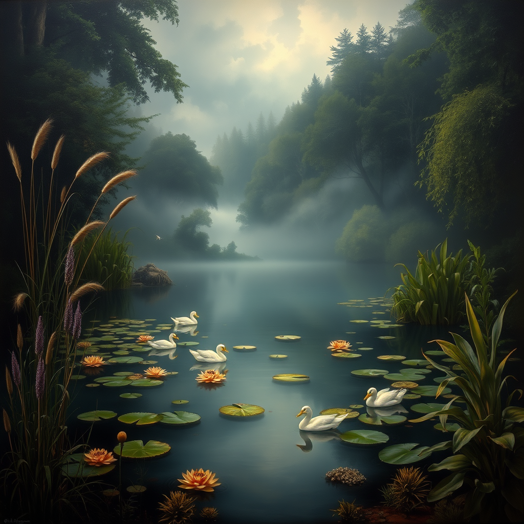 A Renaissance painting of a secluded pond adorned with lily pads and graceful ducks gliding across the water, encircled by towering grasses and lush plants. A mysterious backdrop of dense forest looms beyond, shrouded in mist. The color palette blends dark blues, deep greens, muted grays, soft purples, and golden yellows, casting a brooding and ethereal atmosphere.