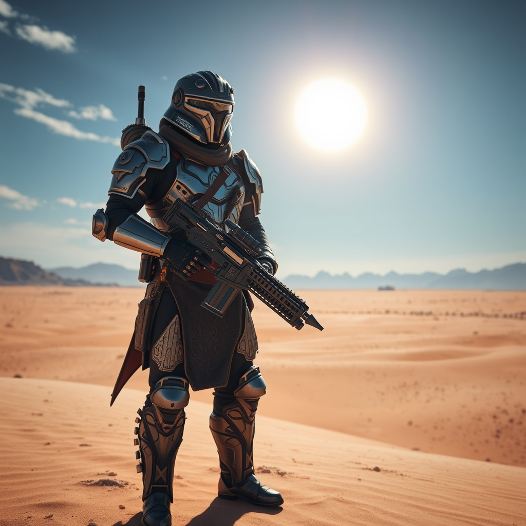 A resilient peacekeeper character stands vigilant amidst a sprawling, futuristic post-apocalyptic desert landscape. The open desert stretches endlessly under a vivid sky, captured in a wide-angle view that enhances its vastness. The peacekeeper is adorned in intricately forged armor that gleams under the harsh sunlight, showcasing a blend of ancient craft and future technology. Clutched in their grasp is a sleek, cutting-edge energy rifle, its design both intimidating and mesmerizing. The scene is cinematic, rendered in HDR 8k quality, bringing out every detail from the shifting sands to the subtle glints of advanced weaponry, creating an awe-inspiring and immersive visual tableau.