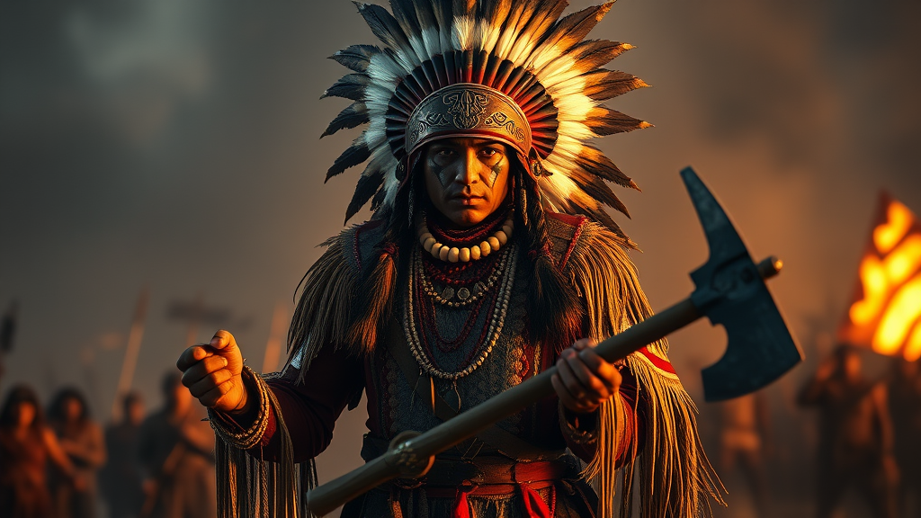 A resolute Apache warrior stands poised on a battleground, his presence fierce and commanding. He is cloaked in an elaborate Native Indian outfit, adorned with intricate beadwork and traditional motifs, each detail a story of his heritage. His war bonnet headdress, majestic and full, frames a face painted with striking symbols, reflecting both tradition and the intensity of conflict. The warrior wields dual axes, their blades glinting in the atmospheric light, poised for action. The environment breathes life with cinematic depth, captured in stunning realism by the dynamic play of natural and ornate cinematic lighting. Shadows fall naturally across the scene, creating a vivid tableau through advanced ray tracing and octane rendering techniques. Every facet, from the embossed textures of his attire to the dramatic illumination, is crafted in high definition, rendered in 8K with photorealistic attention to detail. As the scene unfolds on this digital battleground, there’s a vivid depth of field that draws focus to the warrior, embodying the essence of an ancient and enduring spirit through the lens of modern cinematic artistry, enhanced by RTX tracing and vfx post-production.