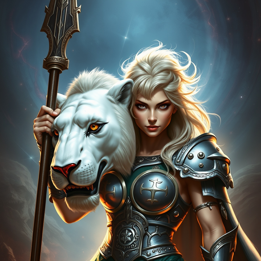 A resolute female warrior, her armor glistening under dynamic lighting, stands triumphant with an immense white lion's head skewered on her spear. The lion's detailed eyes still emit a fierce gaze, its regal mane cascading around her. Her own piercing eyes reflect strength and determination, adorned in intricate armor that shimmers with celestial patterns reminiscent of Peter Mohrbacher's style. The scene is set against a backdrop of swirling celestial hues, enhancing the mythical atmosphere of her victory.
