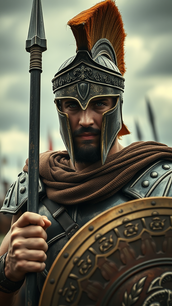 A resolute male Spartan warrior stands firm amidst a battleground, his eyes piercing the camera lens, every facet of his being exuding strength. His finely detailed helm reflects his elite status, crowned with intricate etchings that speak of past glories. Armor gleams under an overcast sky, its surface adorned with elaborate engravings, each telling a tale of valor. In one hand, he grips a formidable spear, its sharpness a testament to his readiness, while his other hand clasps a shield embellished with ornate designs. This scene captures an ultra-realistic essence, featuring cinematic visuals of movie-quality excellence. The photography lighting accentuates the textures, creating realistic shadows with vfx post-production finesse. The depth of field focuses intently on the warrior, while RTX ray tracing lighting and octane rendering techniques enrich the visual drama in stunning 8k resolution.