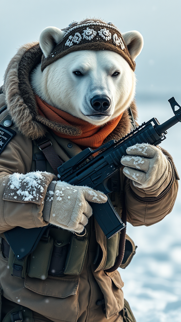 A resolute polar bear dons an intricate winter military uniform, brandishing a tactical carbine rifle, exhibiting anthropomorphic features with a strong, commanding presence. The scene is captured in stunning ultra HD, 8k quality, boasting exquisite facial details that highlight the bear's determined expression. Cinematic lighting enhances the dramatic ambiance of a snow-covered landscape. The overall impression is both awe-inspiring and lifelike, evoking themes of bravery and resilience in the harsh arctic environment.