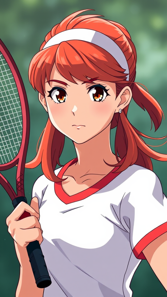 A retro anime-inspired close-up of a young woman in a classic tennis uniform, reminiscent of Misty from Pokemon. She holds a tennis racket confidently, her vibrant red hair styled in a retro 80s fashion. The image captures the essence of 1980s and 1990s anime art styles, blending a nostalgic, hand-drawn aesthetic with realistic 3D anime influences. Her determined expression and the soft glow of classic anime highlights evoke a sense of spirited competition, set against a subtly misty background that enhances the retro vibe.