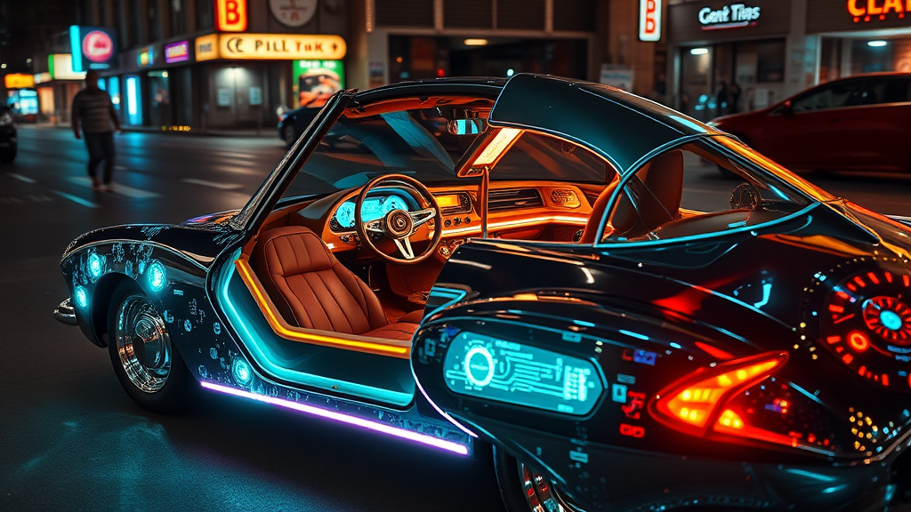 A retro-futuristic automobile adorned with neon accents and sleek, chrome-plated edges, featuring glowing circuits embedded in its transparent body panels; its interior is a harmonious blend of rich leather seating and digital interfaces with a dashboard illuminated by holographic displays, casting dynamic patterns of light throughout the cabin as it hums quietly through the urban nightscape.