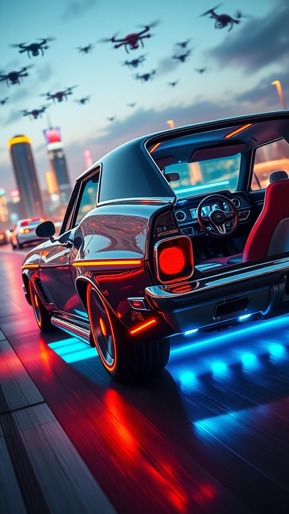 A retro-futuristic automobile with sleek, neon-lit contours and chrome-plated features, resembling a fusion of 1980s muscle car aesthetics and advanced cybernetic technology, equipped with glowing blue undercarriage lights and a holographic dashboard projecting digital landscapes, with interactive AI integrated into the custom leather interior, maintaining an aura of nostalgic allure while cruising through a luminescent cityscape under a sky dotted with flying drones.