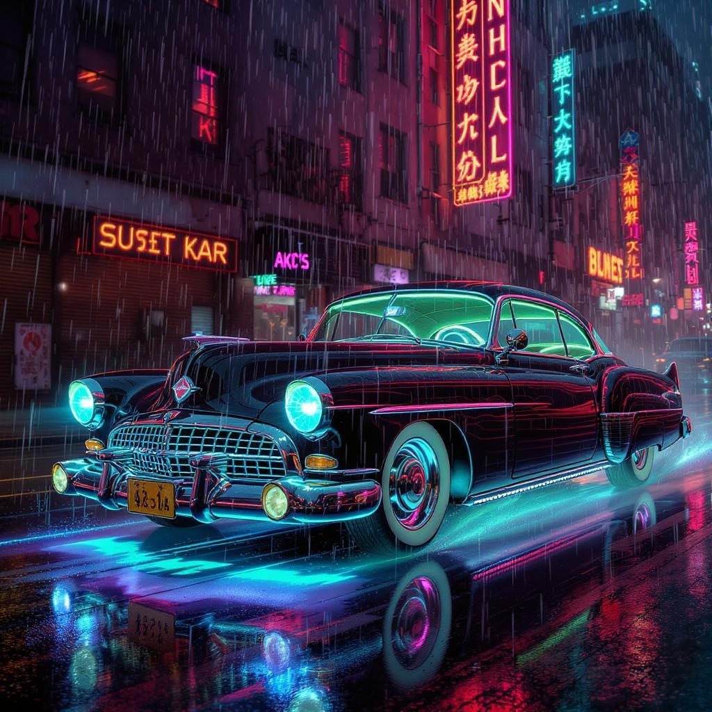 A retro-futuristic car with sleek chrome curves and neon underglow, sporting rotary dial controls and holographic displays, gliding through rain-soaked streets illuminated by flickering neon signs. Vintage leather seats with intricate lattice stitching, pulsating synthwave soundtrack emanating from hidden speakers as raindrops sizzle on the thermo-regulating windows, capturing the essence of a bygone era reimagined through a cybernetic lens.