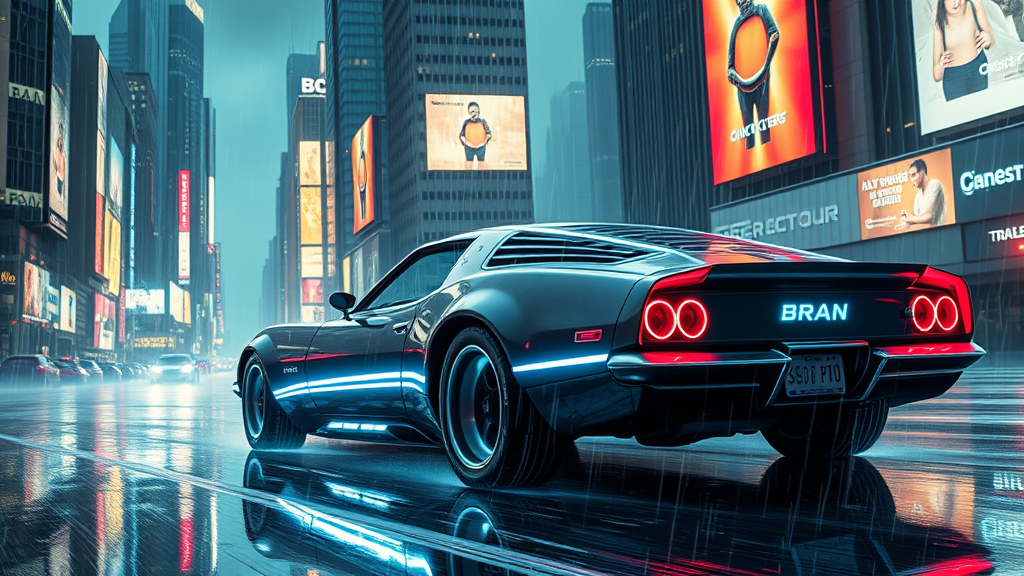 A retro-futuristic cyberpunk car, blending classic 1980s automotive design with advanced neon technology, featuring sleek aerodynamic curves, glowing underbody lights, and holographic dashboard displays, cruising through a rain-drenched cityscape where towering skyscrapers are adorned with pulsating digital billboards.