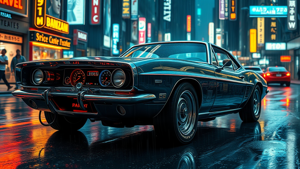 A retro-futuristic cyberpunk vehicle with sleek chrome lines and neon accents, featuring analog gauges and a digital interface seamlessly integrated into the dashboard, adorned with glowing circuit patterns and emitting a low, mechanical hum as it navigates the rain-soaked, neon-lit streets of a bustling metropolis.