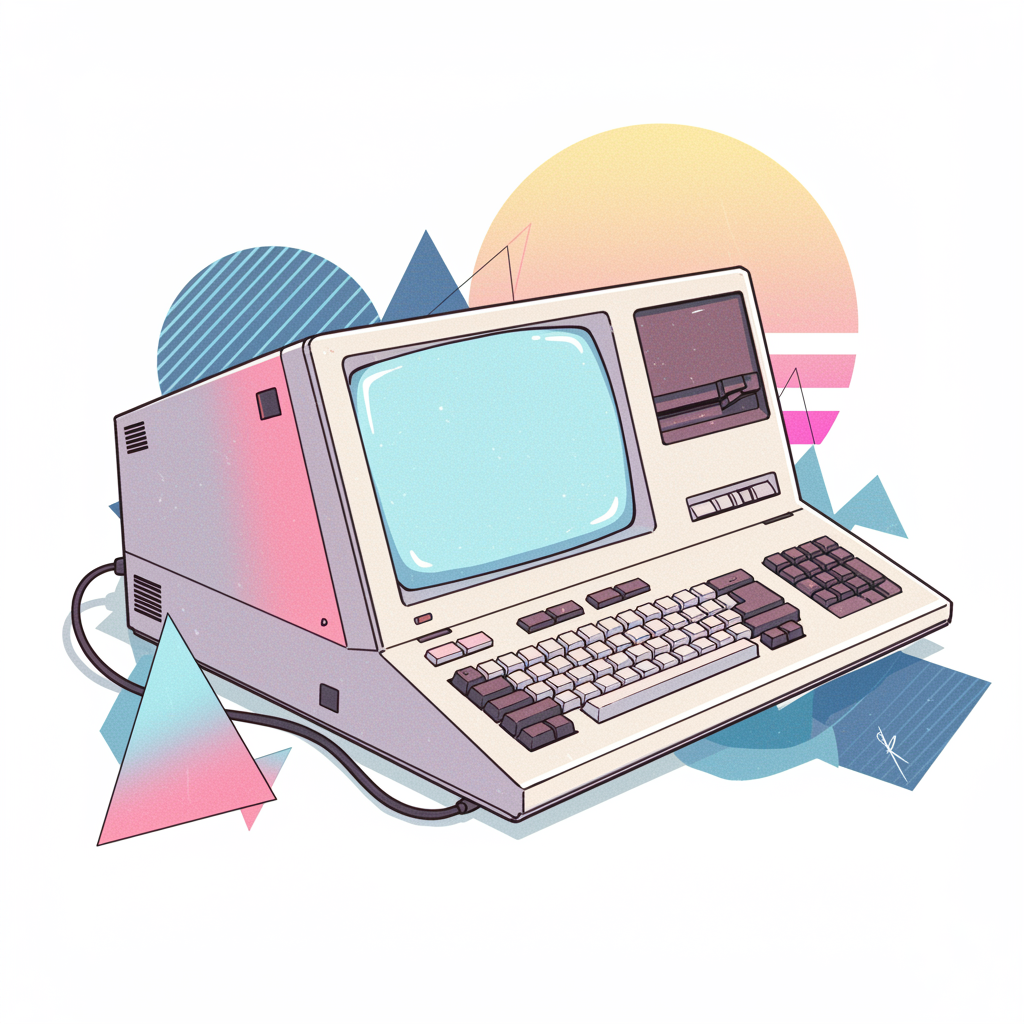 A retro-futuristic illustration featuring a vintage computer, with a vaporwave aesthetic inspired by Jim Steranko's style, showcasing a mix of light pink and light blue hues set against a clean white background, incorporating elements of surrealism and geometric patterns reminiscent of 1980s graphic design, with subtle hints of digital glitch art and neon highlights for an otherworldly touch.