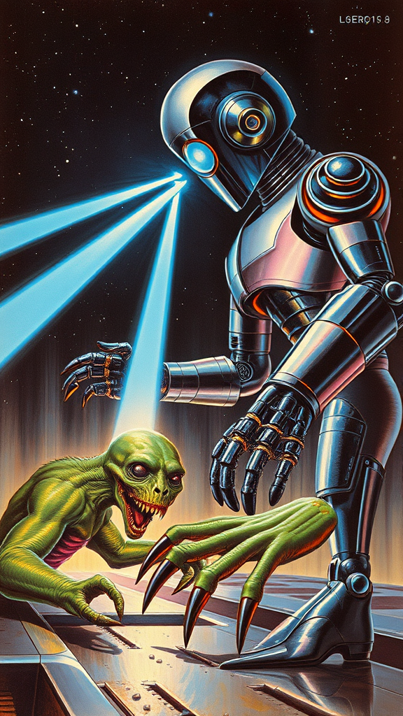 A retro-futuristic scene unfolds on the cover of a science fiction book, where a sleek, humanoid robot with a polished chrome finish stands poised in dramatic confrontation. It unleashes piercing blue laser beams from its glowing eyes, illuminating the dark, starry backdrop. The beams strike towards an alien creature, its skin a iridescent palette of greens and purples, as it struggles against the pull of robotic claws gripping its legs. The alien's expression is a mix of astonishment and defiance, its elongated fingers clawing at the metal floor beneath. Inspired by the dynamic artistry of Robert McGinnis and Frank Frazetta, the illustration captures the intensity and drama with bold, vivid colors and striking contrasts, merging classic pulp aesthetics with a vibrant sense of movement and tension.