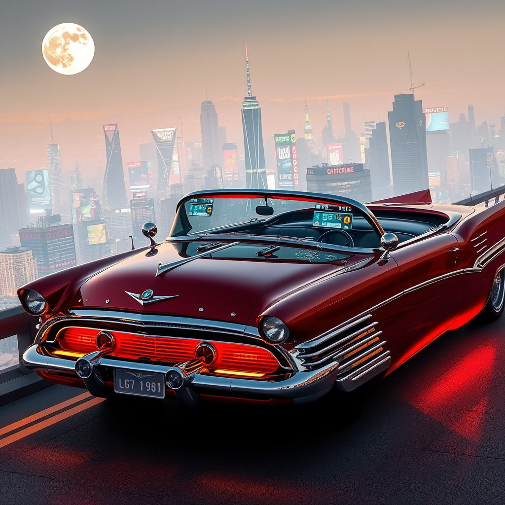 A retro-futuristic vehicle blending the sleek lines of 1950s classic cars with advanced cybernetic technology, featuring chrome-plated accents and neon underglow, the car's dashboard bristling with holographic displays and analog dials, its engine humming with the deep, resonant pulse of a fusion core, while augmented reality windshields overlay digital navigation data against the backdrop of a sprawling cityscape illuminated by endless digital billboards and flickering neon signs, all set beneath the soft glow of a smog-covered moon.