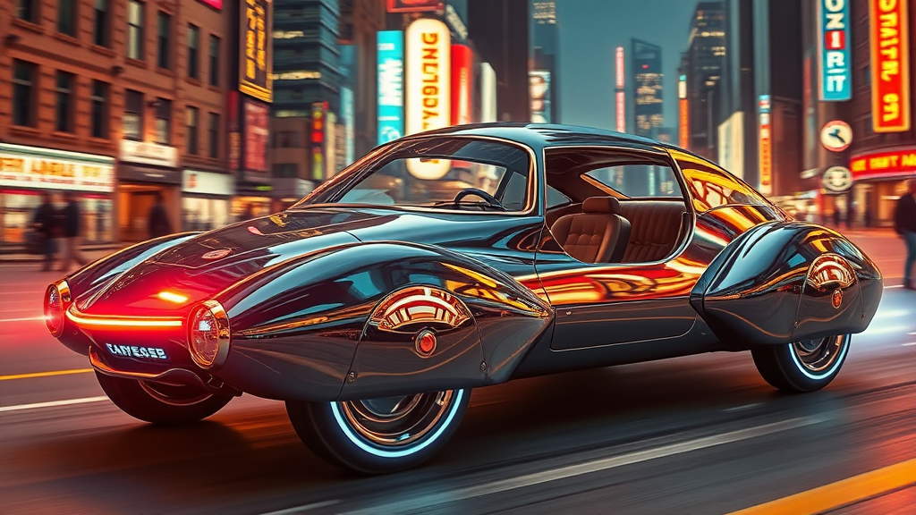 A retro-futuristic vehicle with a chrome-plated, angular body gliding through a neon-lit cityscape, its elongated chassis adorned with pulsating LED accents and holographic hubcaps, echoing a blend of mid-20th-century automotive elegance with sleek, cutting-edge technology, while its transparent canopy reveals an interior filled with glowing touchpads and vintage leather upholstery.