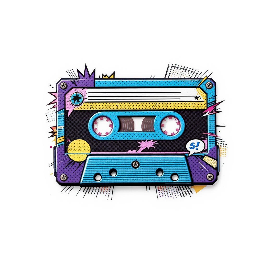 A retro-inspired cassette tape icon rendered in a carbon fiber style, featuring a vibrant blue and purple palette with bold, graphic detailing reminiscent of Roy Lichtenstein's pop art. Set against a clean white background, the design exhibits dynamic dots and lines that capture the essence of 1960s comic book aesthetics, creating a fusion of vintage and modern artistic elements.