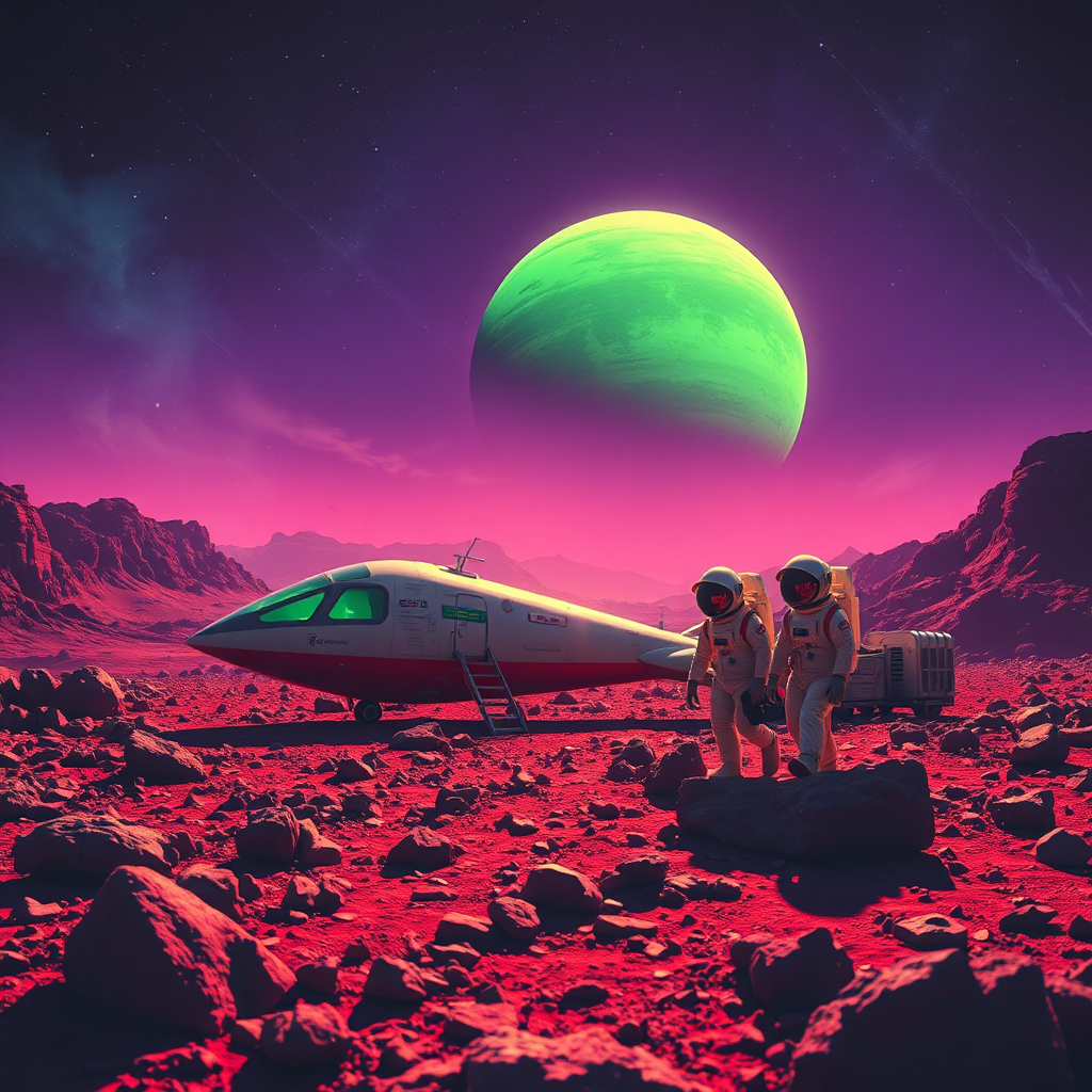 A retro-inspired scene showcasing an alien spacecraft parked on the rocky surface of an exoplanet. Two astronauts, clad in vintage-looking space suits, are exploring the terrain with curiosity. In the background, a vibrant green gas giant looms, casting an ethereal glow over the landscape. The sky is a swirl of deep purples and blues, dotted with distant stars. The overall atmosphere combines the adventurous spirit of the 70s with a futuristic, otherworldly charm.