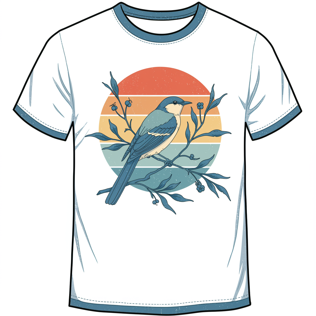 A retro-inspired t-shirt design featuring a tranquil bird perched on a flourishing branch, exuding an abstract aesthetic with a touch of timeless elegance. The creation is reminiscent of Don Martin's classical style, highlighted by a gradient transition of soft blues along the edge against a pristine white background. The overall composition maintains an HD quality with a raw, artistic finish, subtly modernized for a unique flair.