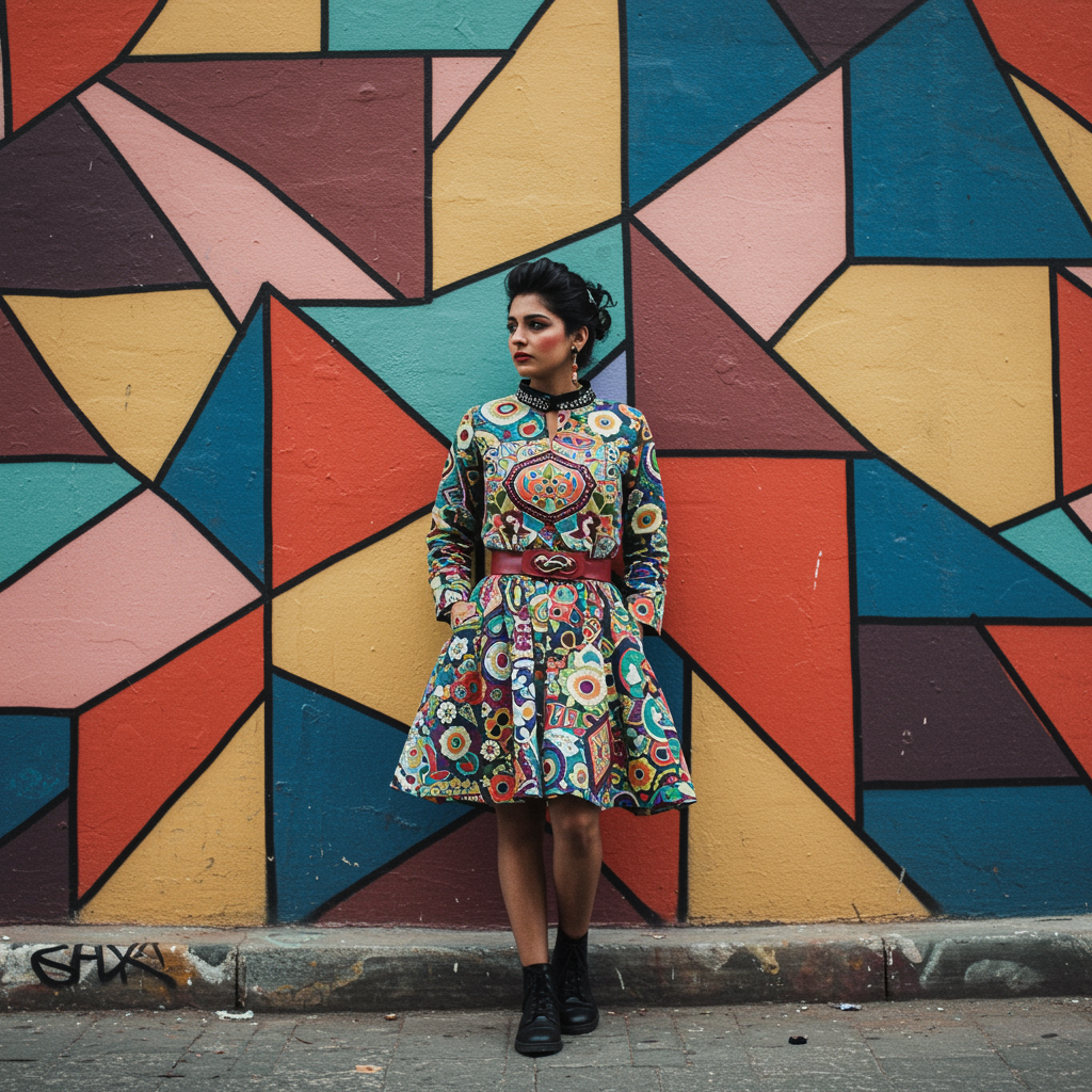 A retro street photographer in vibrant Santiago captures a poised model standing against dynamic graffiti comprised solely of geometric, colorful shapes. The outfit seamlessly merges hues and patterns, featuring elaborate details reminiscent of Tokyo Fashion Week, creating a striking visual harmony with the mural backdrop.