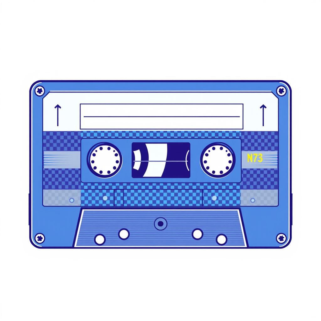 A retro-themed illustration of a cassette tape with a carbon fiber texture, featuring a vibrant blue and purple color palette. The artwork draws inspiration from Roy Lichtenstein's pop art style, set against a clean white background. Subtle geometric patterns and halftone dots enhance the retro aesthetic.