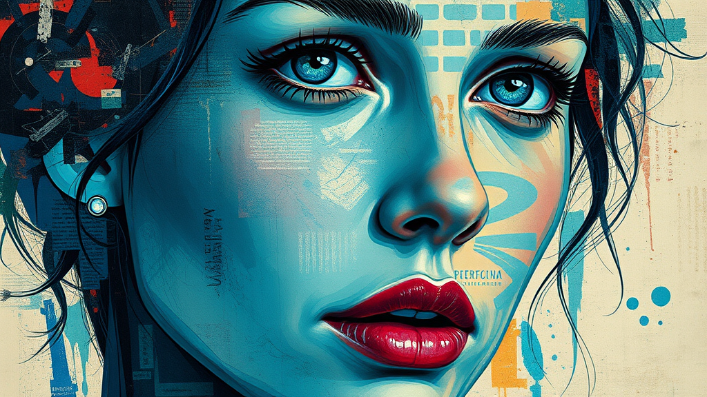 A richly detailed and multi-layered collage of a woman's face, infused with the painterly style of Josef Kote, combining elements of grunge beauty and the intricate detail of Dain Yoon. The color palette is dominated by vibrant cyans and deep blues, drawing inspiration from the realistic textures of Antonio Mancini. The composition features an imaginative blend of fragmented layers and abstract forms, showcasing a balance between hyper-realism and artistic abstraction, with a subtle yet striking emphasis on the play of light and shadow.