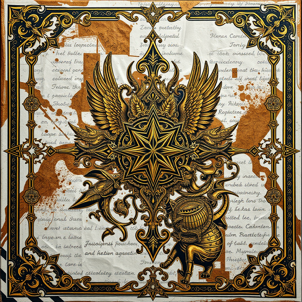 A richly detailed book cover filled with an intricate collage design integrating dark gold and white hues, inspired by ancient art elements and digitally enhanced for a modern touch. The composition employs foreshortening techniques and features tattoo-inspired motifs, blending traditional and contemporary aesthetics to create a visually captivating piece. The cover's imagery weaves mythology and symbolism, with ornate patterns drawing the viewer into a world of timeless storytelling.