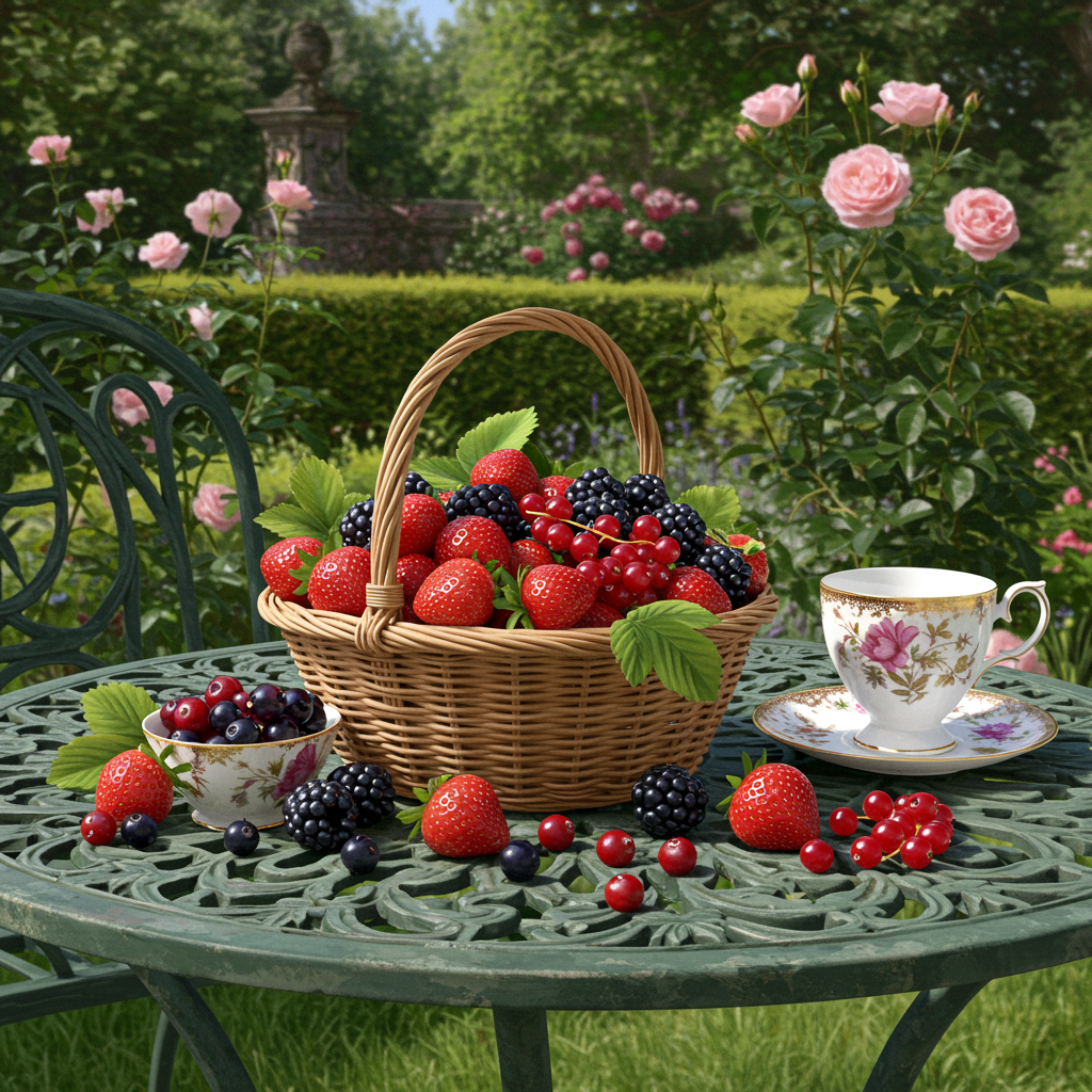 A richly detailed depiction of a Victorian-era basket brimming with ripe strawberries, juicy blackberries, and tart cranberries, set on an ornate wrought iron garden table. The scene is nestled within an opulent Victorian garden, where blooming roses and manicured hedges form a lush background. Sunlight filters through the leaves, casting dappled shadows across the vibrant fruits and the table's intricate patterns, enhancing the vivid colors and realistic textures of the berries. Nearby, a delicate china teacup adds a touch of elegance, capturing the essence of a timeless afternoon in the garden.