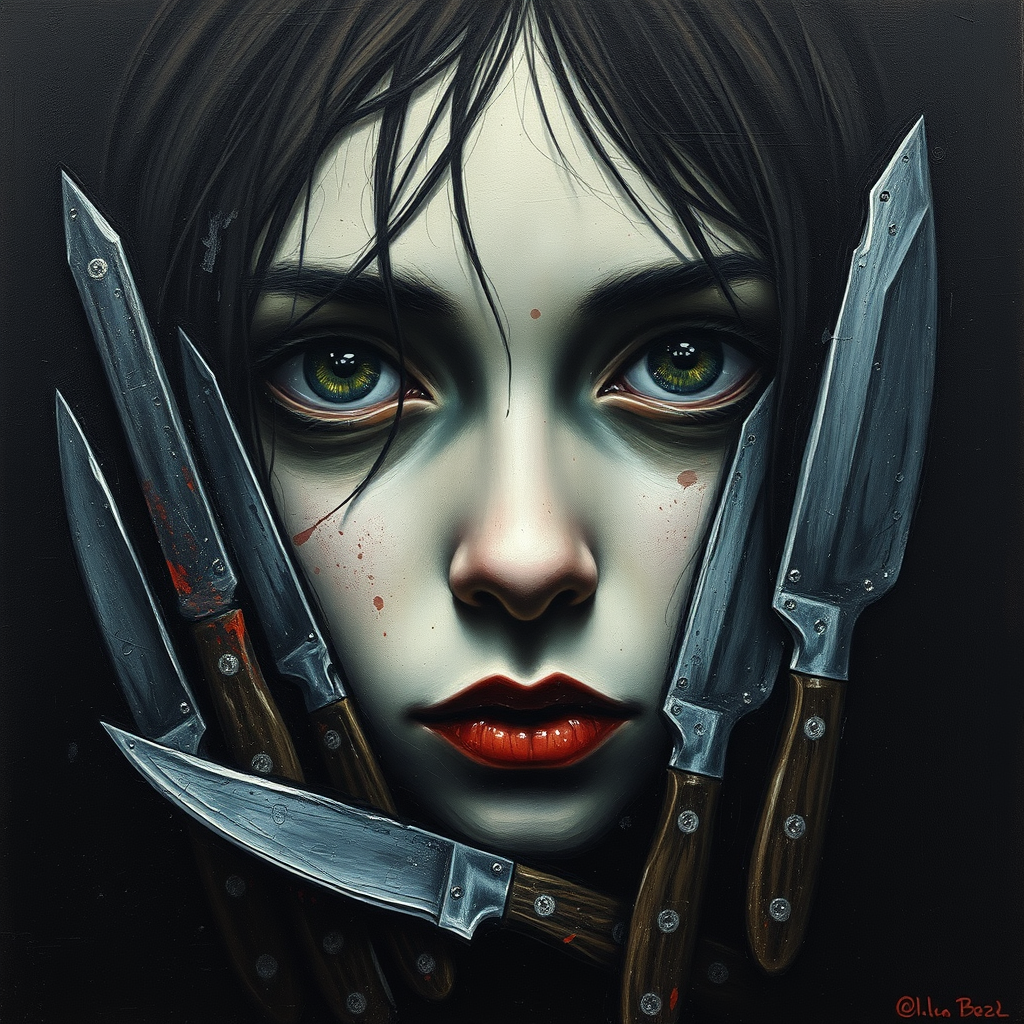 A richly detailed, minimalist avant-garde oil painting portrays a girl's face with haunting, empty eyes. The grainy texture accentuates a dark, mysterious mood, while numerous knives subtly integrate into the composition. The rough strokes and raw style highlight a sense of intrusion, capturing an enigmatic essence.