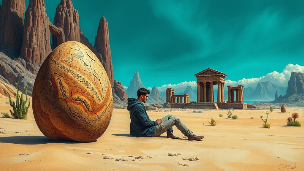 A richly detailed oil painting portrait in the style reminiscent of John Singer Sargent, blended with the intricate lines and stunning colors inspired by Alphonse Mucha and Moebius. A contemplative figure sits forlorn in a vast, sandy desert, accompanied by two large, intricately textured dinosaur eggs. The background reveals an alien planet landscape beneath a vivid turquoise sky, featuring towering, jagged rock formations and peculiar plant life. In the far distance, the enigmatic ruins of an ancient, forgotten civilization are partially visible, their once-great structures now weathered and crumbling. The scene captures a sense of timeless solitude and wonder, as the figure ponders the mysteries of this otherworldly setting.