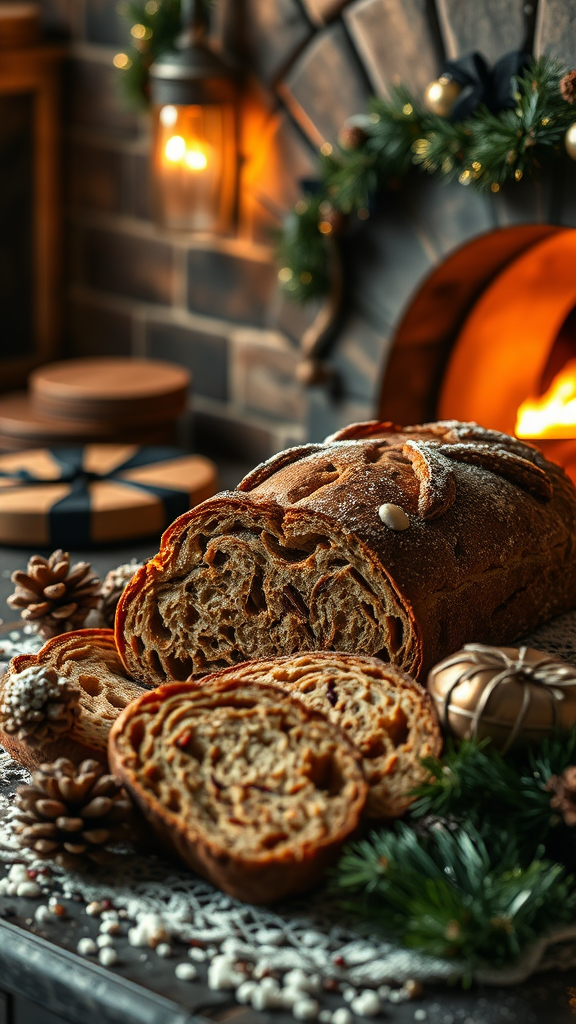 A richly detailed still life featuring traditional Christmas stollen bread, set against a luxurious black and gold color palette, exuding warmth from a nearby wood-burning oven. The scene captures a cozy atmosphere in 8k photorealistic detail, with realistic lighting that highlights the intricate textures of the bread and surrounding elements. The wide-angle kinkfolk photography style creates an inviting composition, enhanced by subtle touches of A+D architecture in the background, adding an elegant structure and depth to the setting.