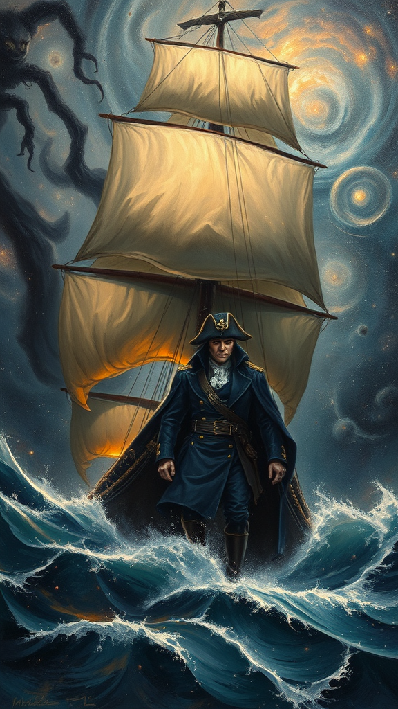 A richly textured oil painting featuring a pirate ship navigating through stormy cosmic seas, its sails billowing with an ethereal glow. The ship's ominous captain stands at the helm, his presence both commanding and enigmatic, adorned in an intricately detailed coat reminiscent of a regal, otherworldly figure. The scene is imbued with a sense of cosmic horror, with swirling galaxies and dark, looming celestial entities in the background. The artwork evokes an elegant yet unsettling atmosphere, capturing the mystique of an uncharted universe, a masterful concept akin to the detailed and imaginative style of Craig Mullins on ArtStation.