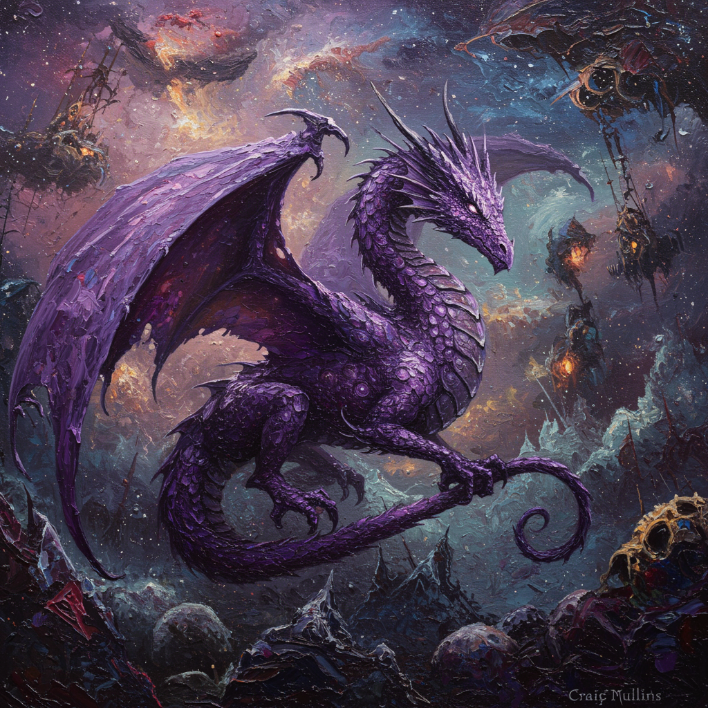 A richly textured oil painting with heavy impasto depicting a majestic purple dragon amidst a surreal cosmic landscape, its scales glistening like polished amethyst. The scene evokes an aura of cosmic horror, with swirling nebulas and distant galaxies casting an ethereal glow. The dragon's eyes shimmer with an ancient, mysterious wisdom, as intricate patterns reminiscent of Craig Mullins' style adorn its wings, mixing elegance with a touch of the fantastical. The background features otherworldly structures, seemingly alive, adding depth to the otherworldly scene. The overall composition invites the viewer into a mesmerizing, dreamlike realm where reality and imagination blur.