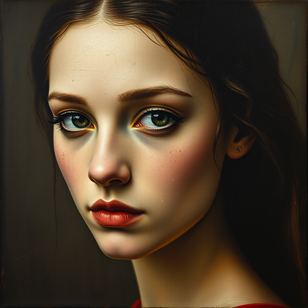 A richly textured portrait of a woman, capturing the essence of an oil painting with a grainy texture. Her features are depicted with an empty, haunting gaze, blending minimalist avant-garde elements with intricate detailing. The piece echoes the timeless style of Diego Velazquez, reminiscent of an old masterpiece, enveloped in a harmonious blend of tradition and modernism, set against an elongated 16:9 canvas with a subtle yet expressive stylization.