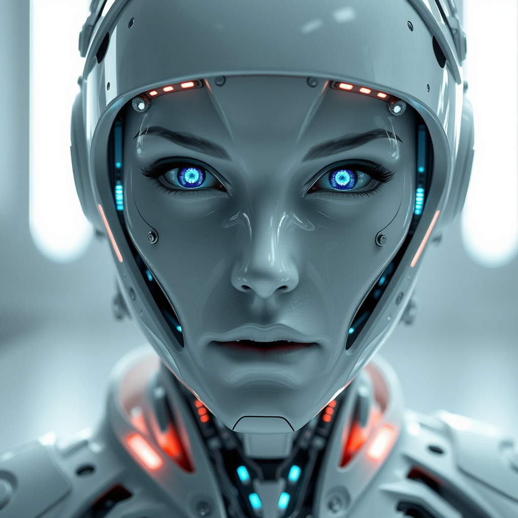 A robot face embodied in futurism and cyborg aesthetics, featuring a sleek futuristic latex space suit interwoven with glowing transparent tubes and intricate mechanics. The medium and distant composition highlights the technology-infused design from the thigh to the waist, accentuated by striking blue eyes. Emphasizing cutting-edge technology with a hard surface fashion approach, the scene is captured in sharp focus and high detail, reminiscent of cinema's finest with a white color palette. Minimalistic yet futuristically realistic, it exudes ultra-realism and photorealism under a cinematic and studio lighting set-up. The mechanical and hard surface elements are rendered meticulously in 3D using octane render and unreal engine, ensuring highly detailed visuals in 8k and 4k resolution, with a glossy finish.